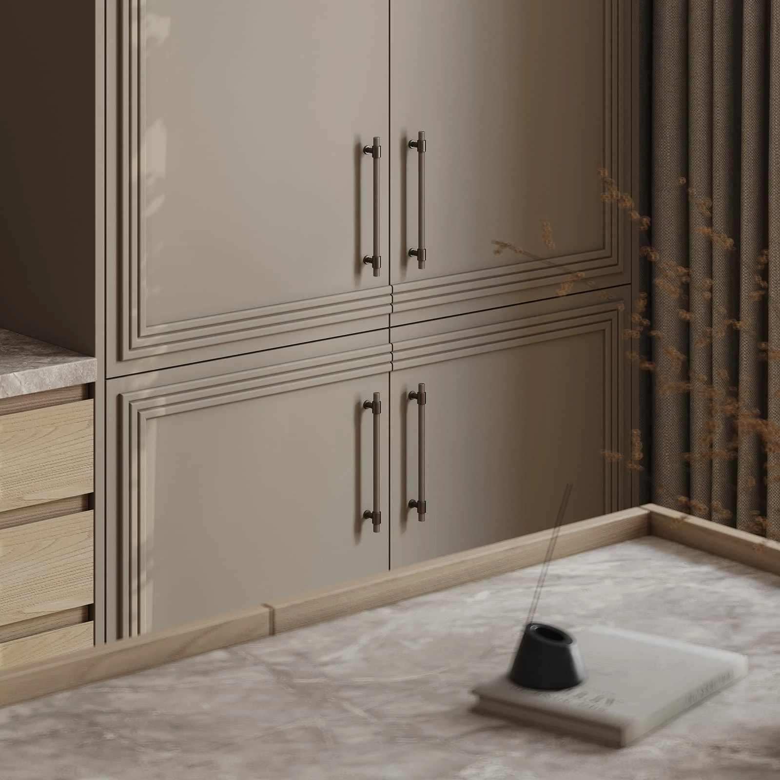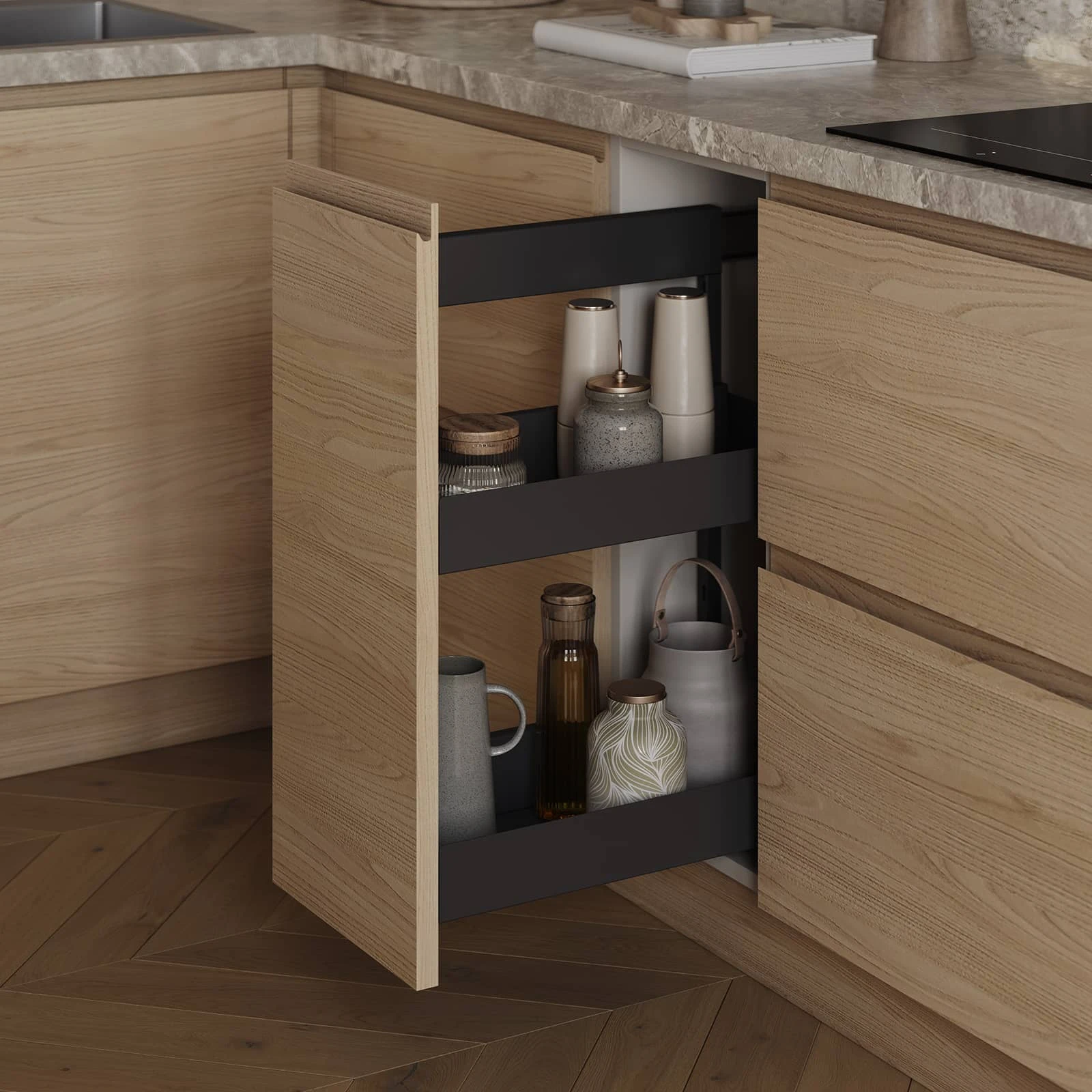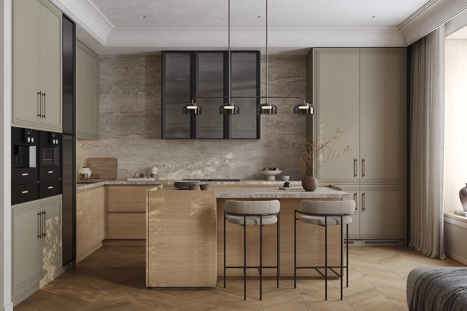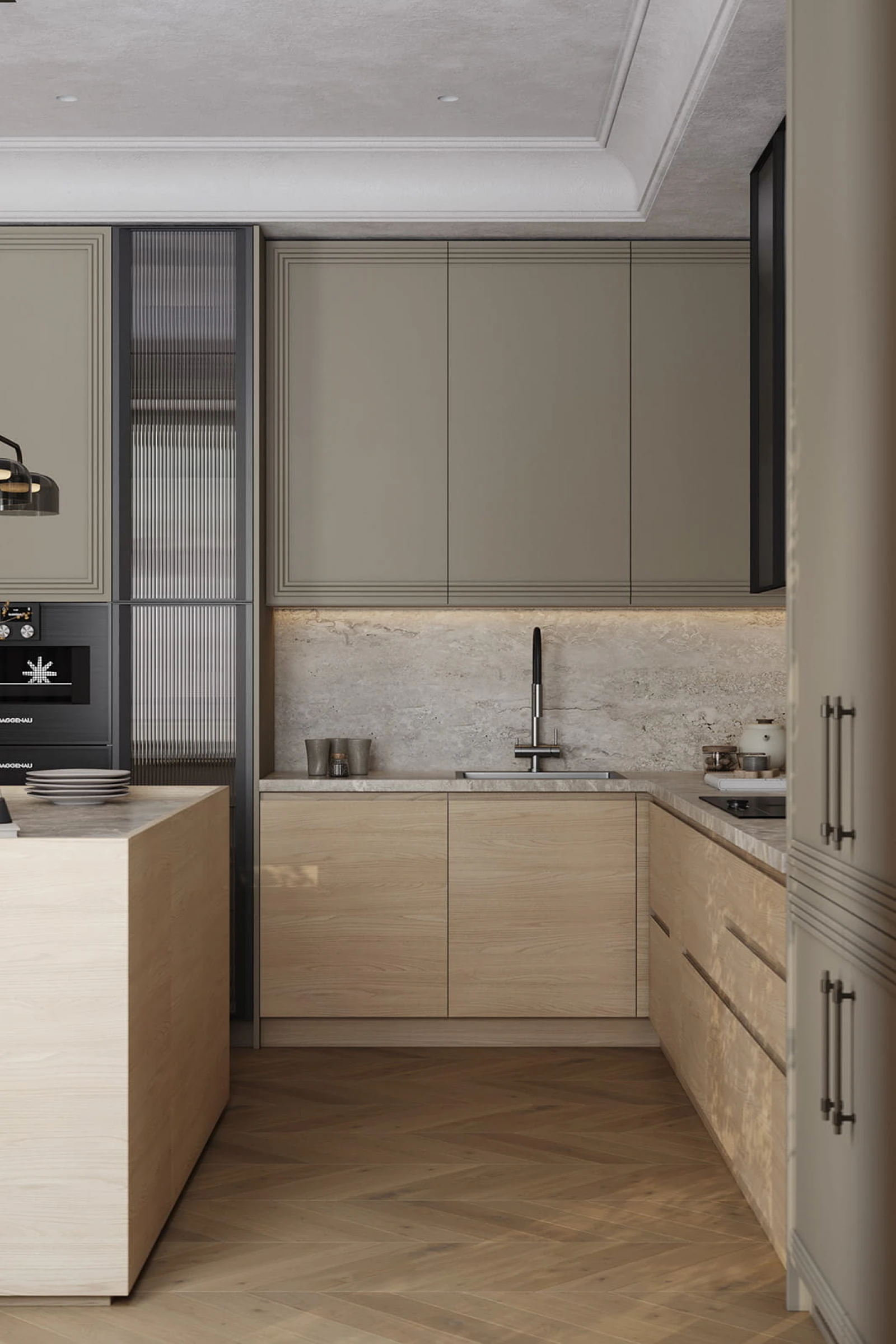 Т422 / Т419Г Шпон дуба, цвет #183 (масловоск Бесцветный) / Т650 Крашеная МДФ, цвет NCS S 4005-G80Y Матовый,