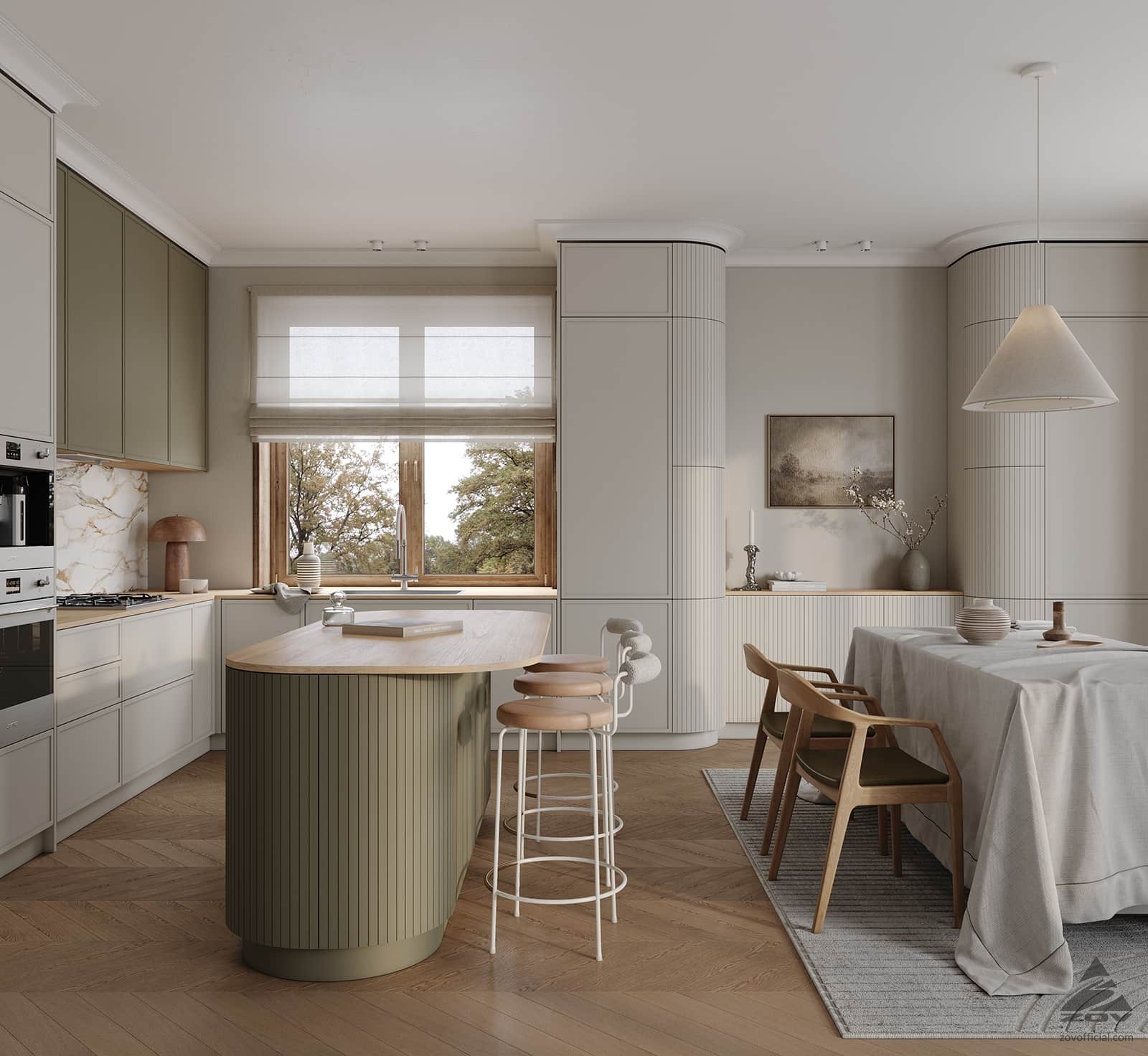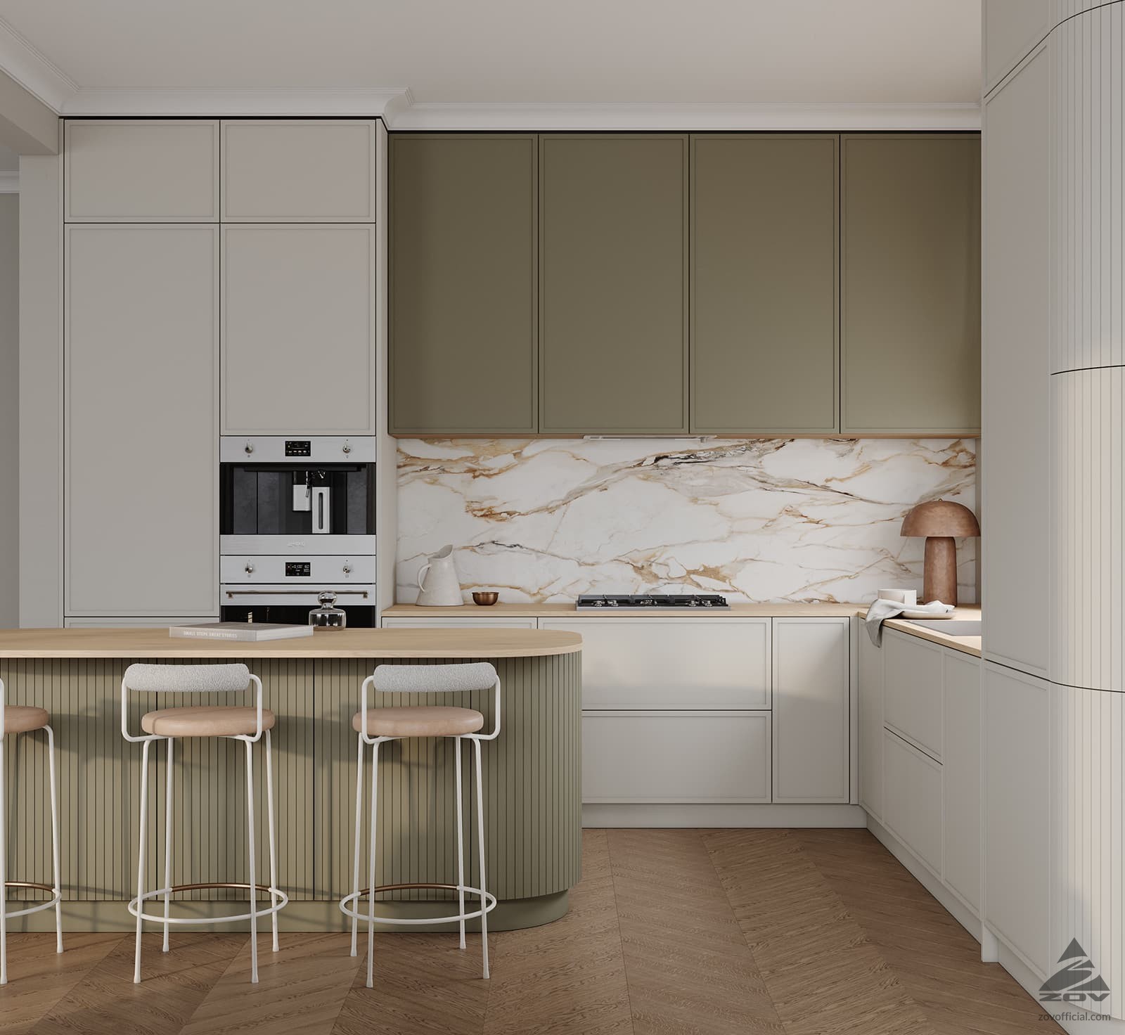 ФАСАДЫ Рокси (крашеная МДФ) / Аврора (крашеная МДФ), цвет NCS S 4020-G30Y Матовый / NCS S 1500-N Матовый, СТОЛЕШНИЦА Пластик HPL, 20 мм