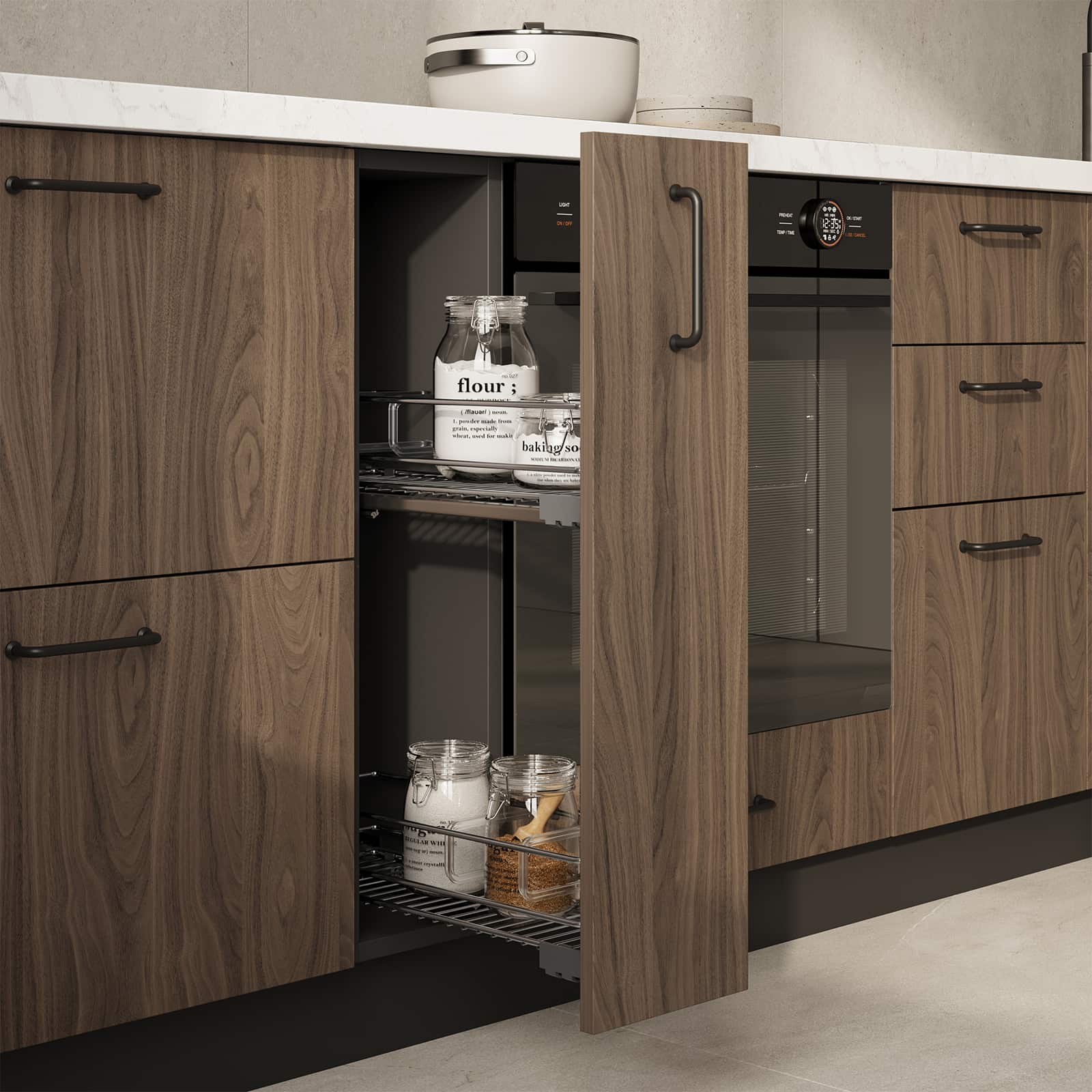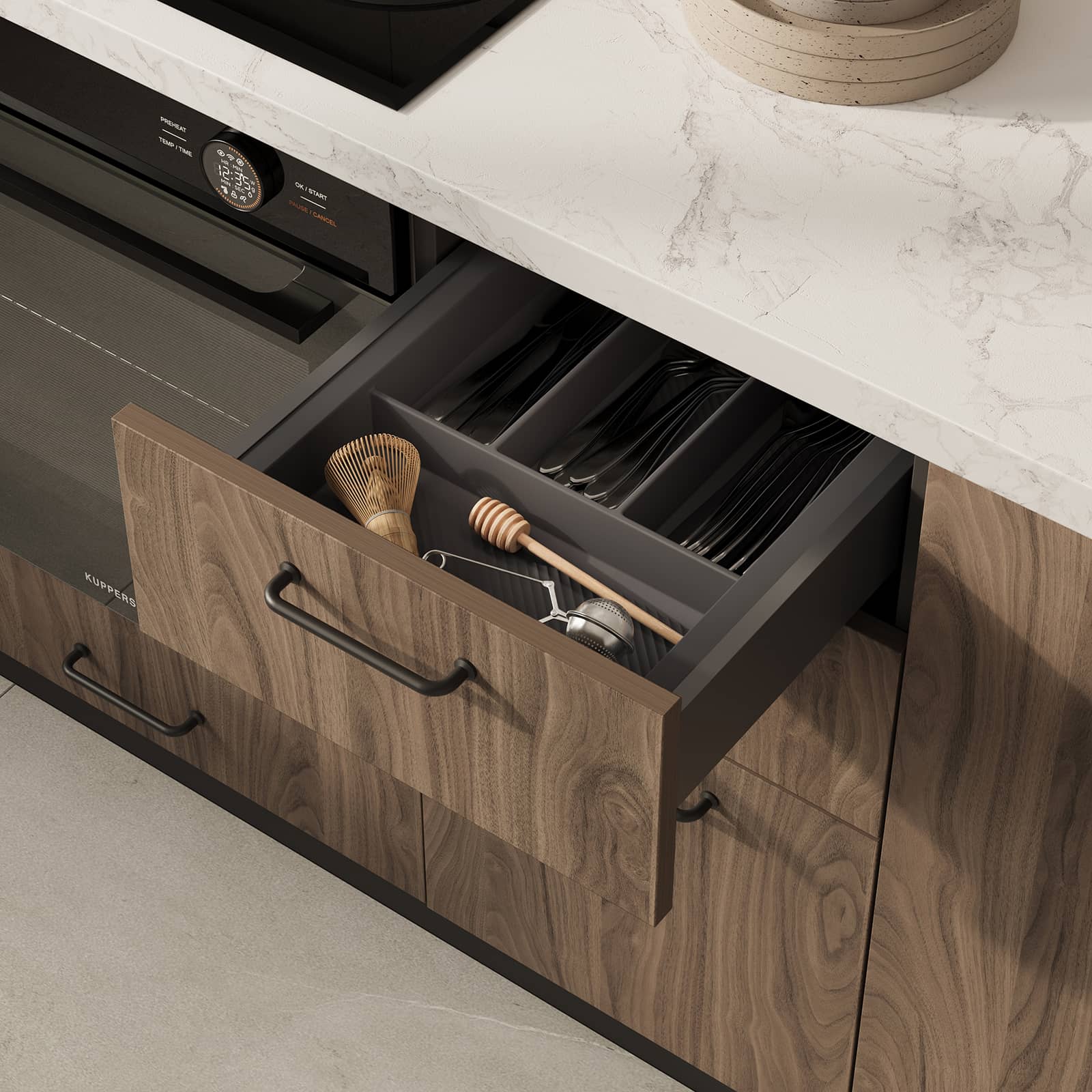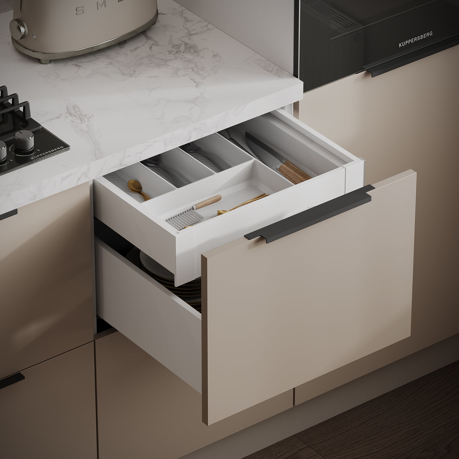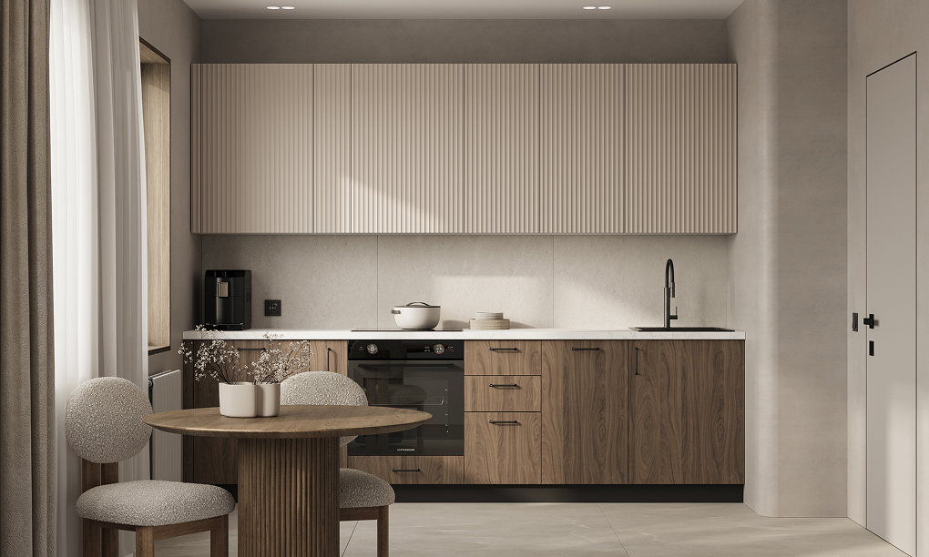 Фасады Авис (МДФ/ПВХ), цвет Сатин Песочный Ф Premier Matt / ЛДСП 18 мм, декор Орех Карини Натуральный, Столешница Пластик HPL, декор Мрамор Бернини (толщина 38 мм, кромка ABS), Корпус ЛДСП, цвет Серый Камень / Графит (толщина 18 мм)