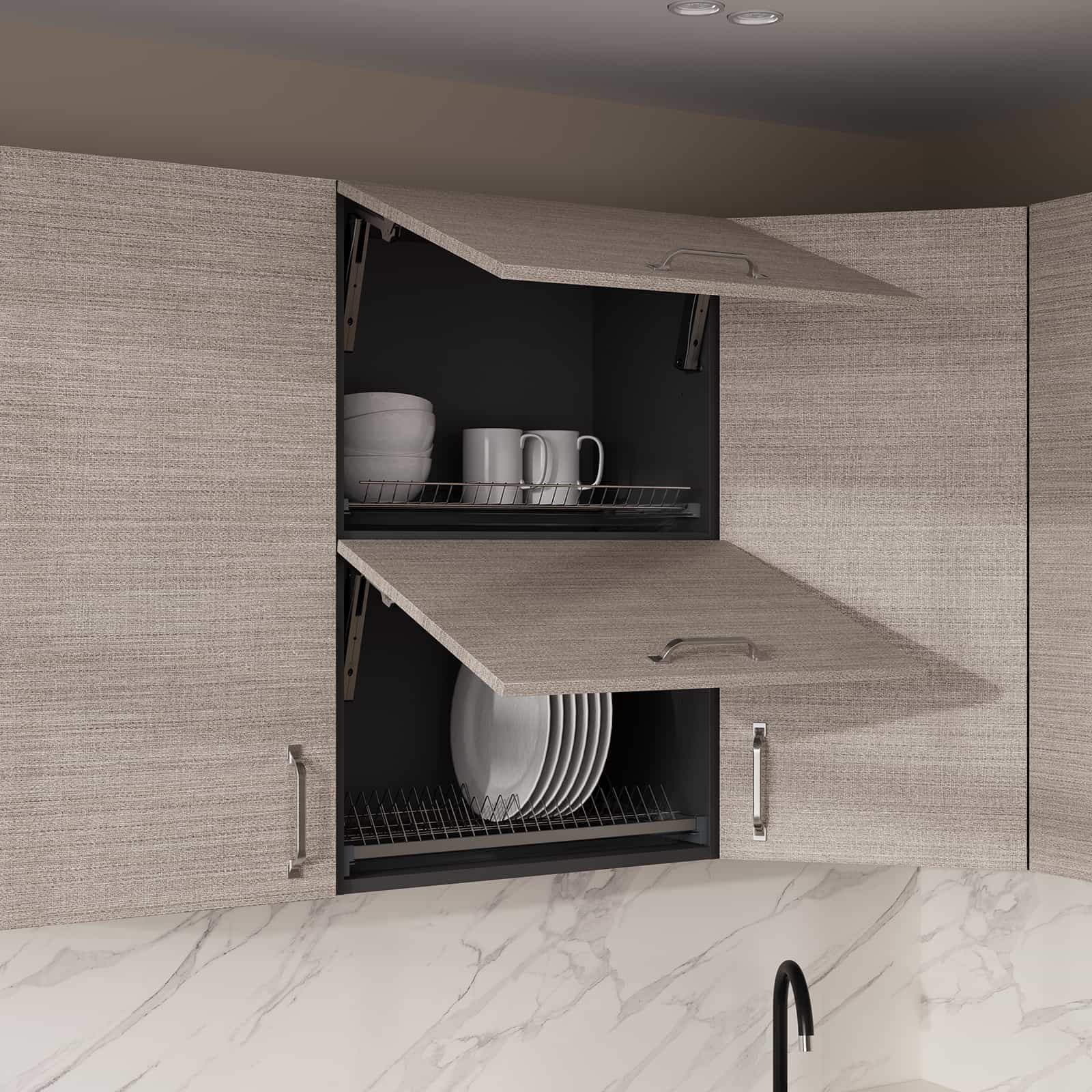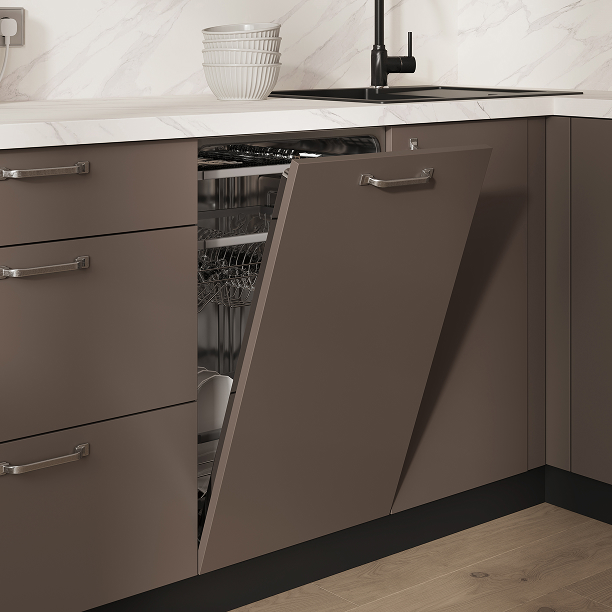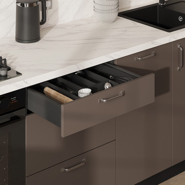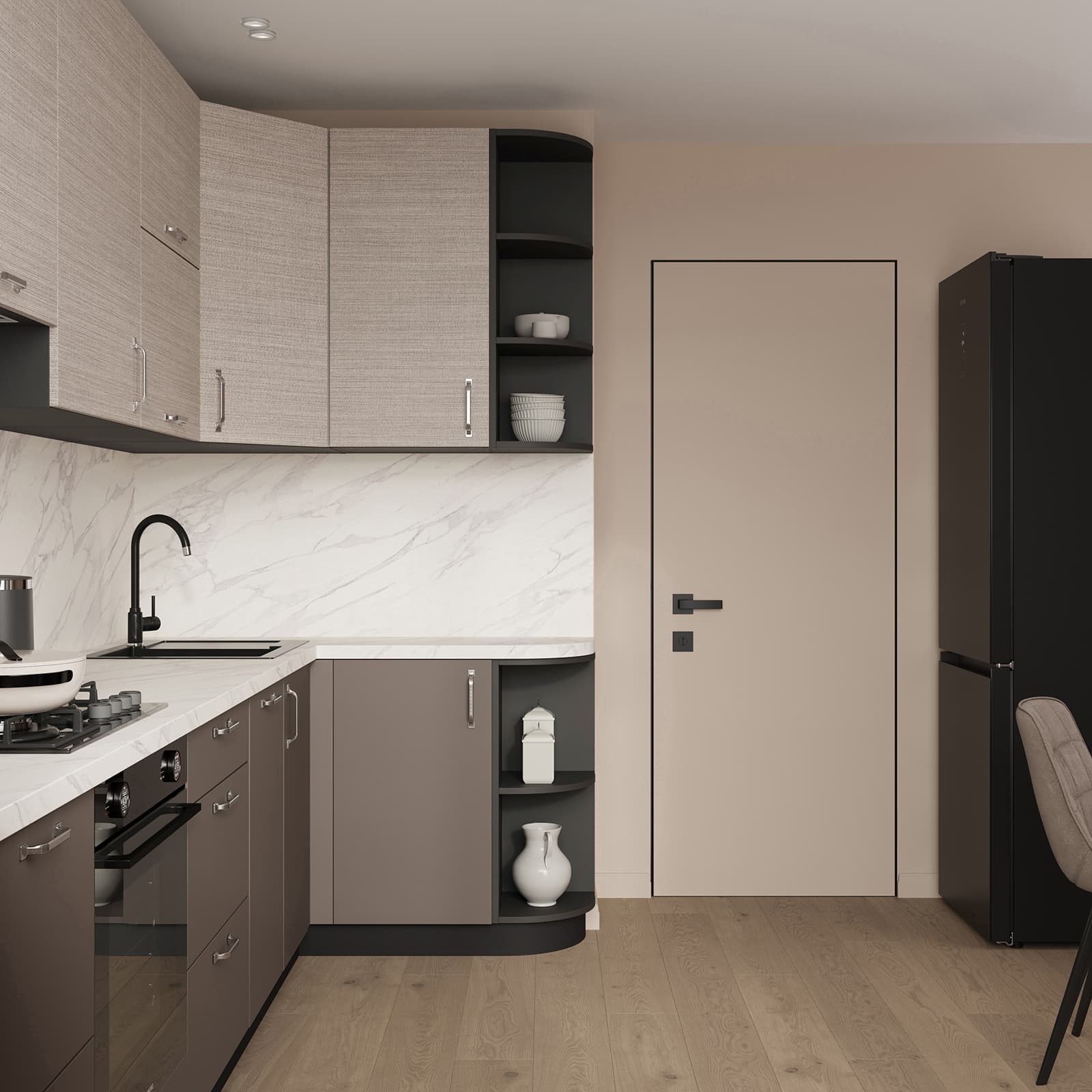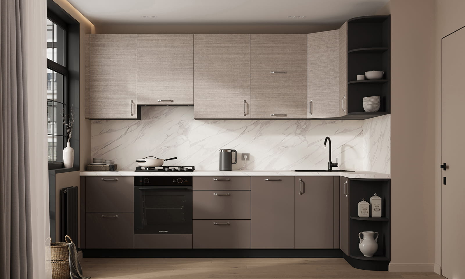 Фасады ЛДСП, декор Тессеа Серовато-бежевый / Трюфель Коричневый (толщина 18 мм), Столешница Пластик HPL, декор Мрамор Олимпия (толщина 38 мм, постформинг), Корпус ЛДСП, цвет Графит (толщина 18 мм)