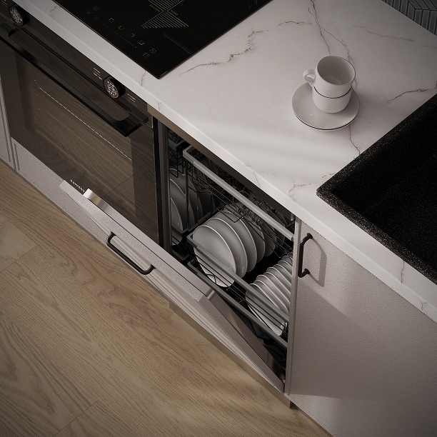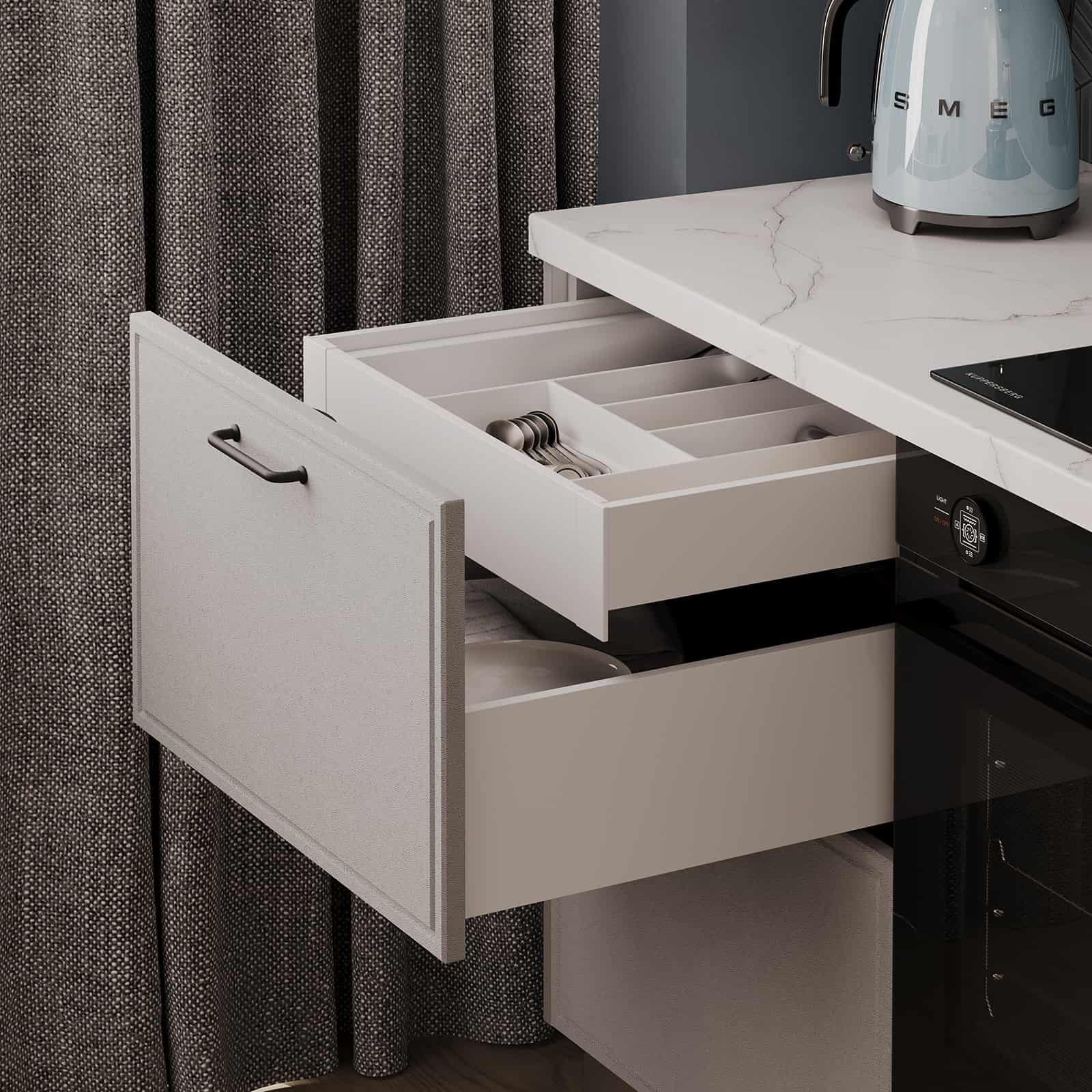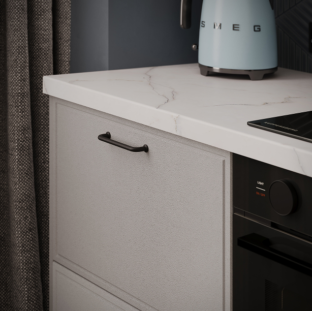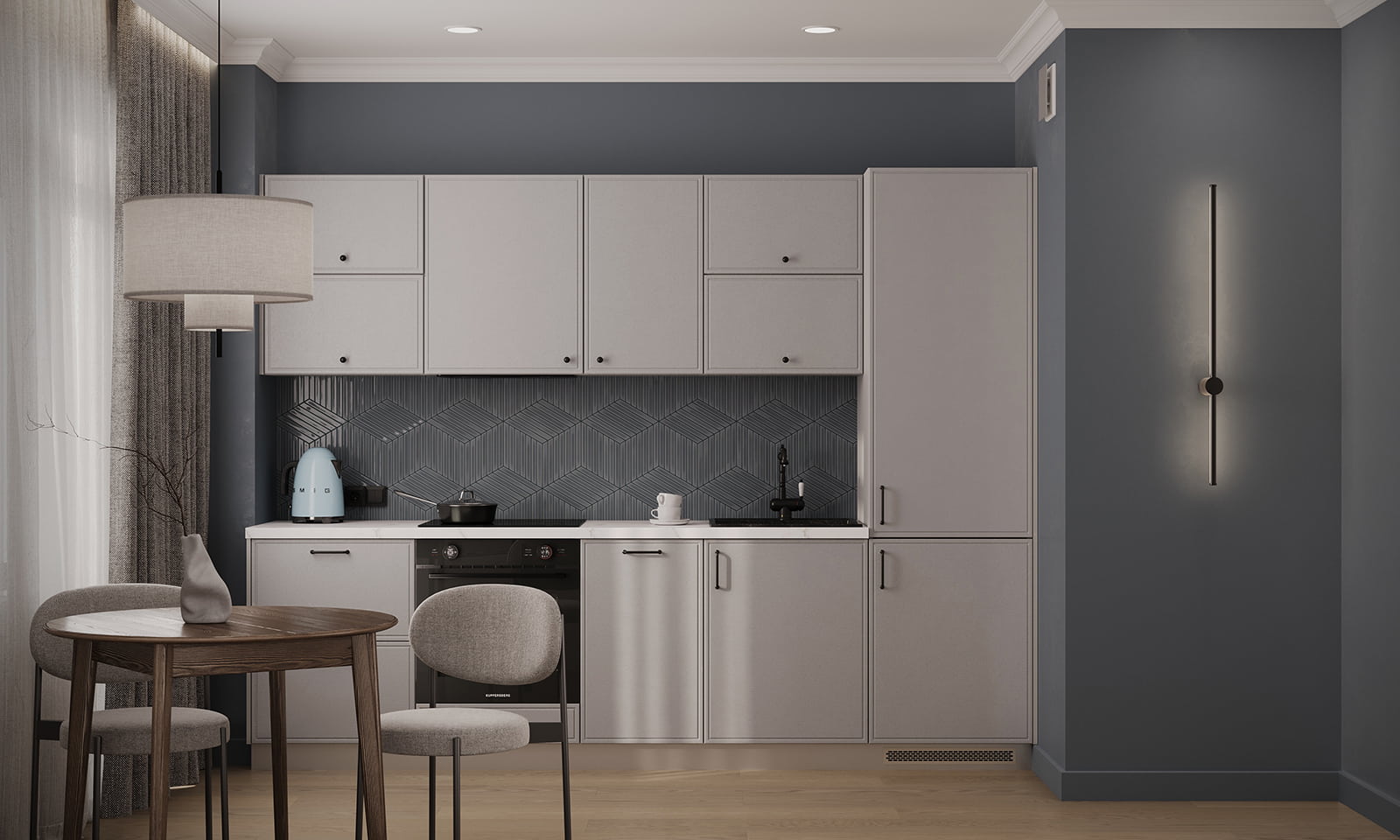 Фасады Депримо (МДФ/ПВХ), декор Камень Светлый, Столешница Пластик HPL, декор Миони (толщина 38 мм, постформинг), Корпус ЛДСП, цвет Серый Камень (толщина 18 мм)