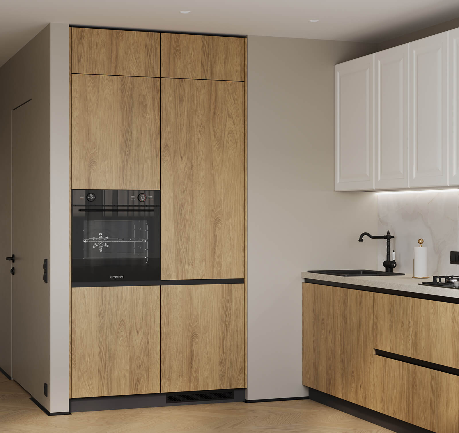 ЛДСП Вуд, декор Гикори Натуральный / Эрден (МДФ/ПВХ), цвет Белый Матовый / алюминиевый профиль А-2 Терра Черная (стекло Графит прозрачное),
