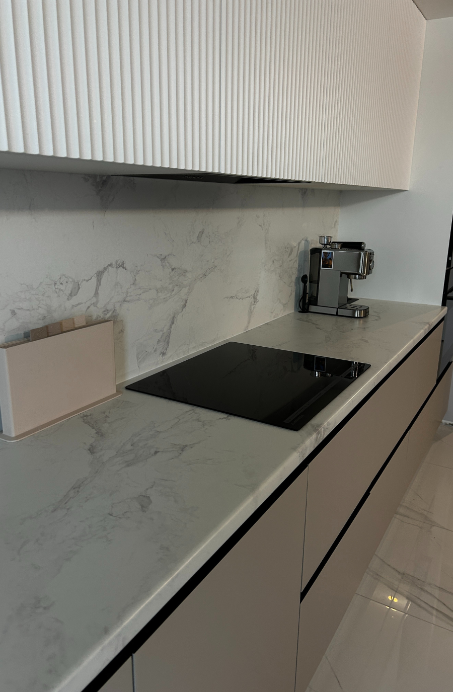 Минималистичная кухня в светлых тонах с древесной текстурой