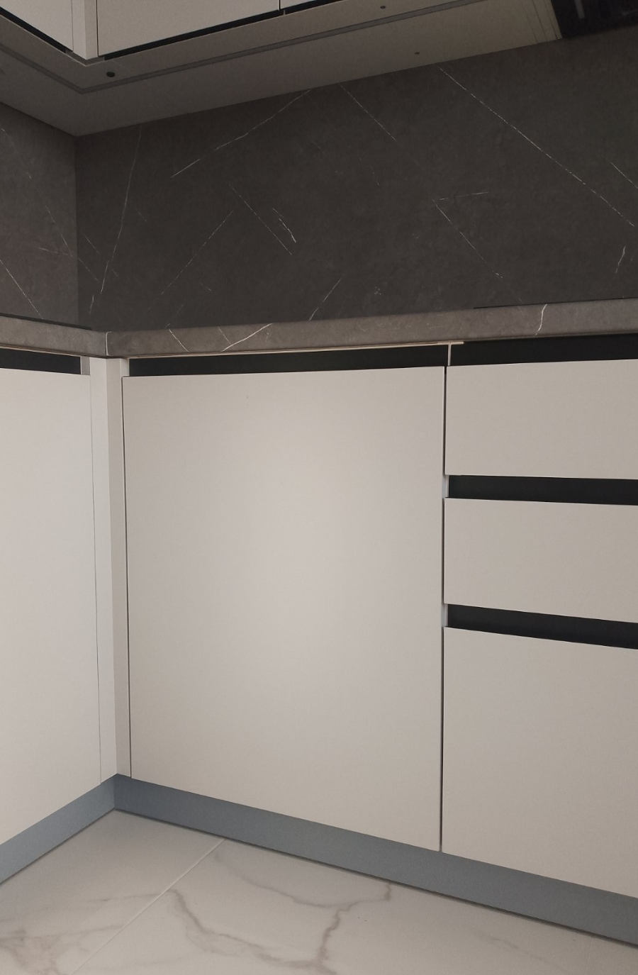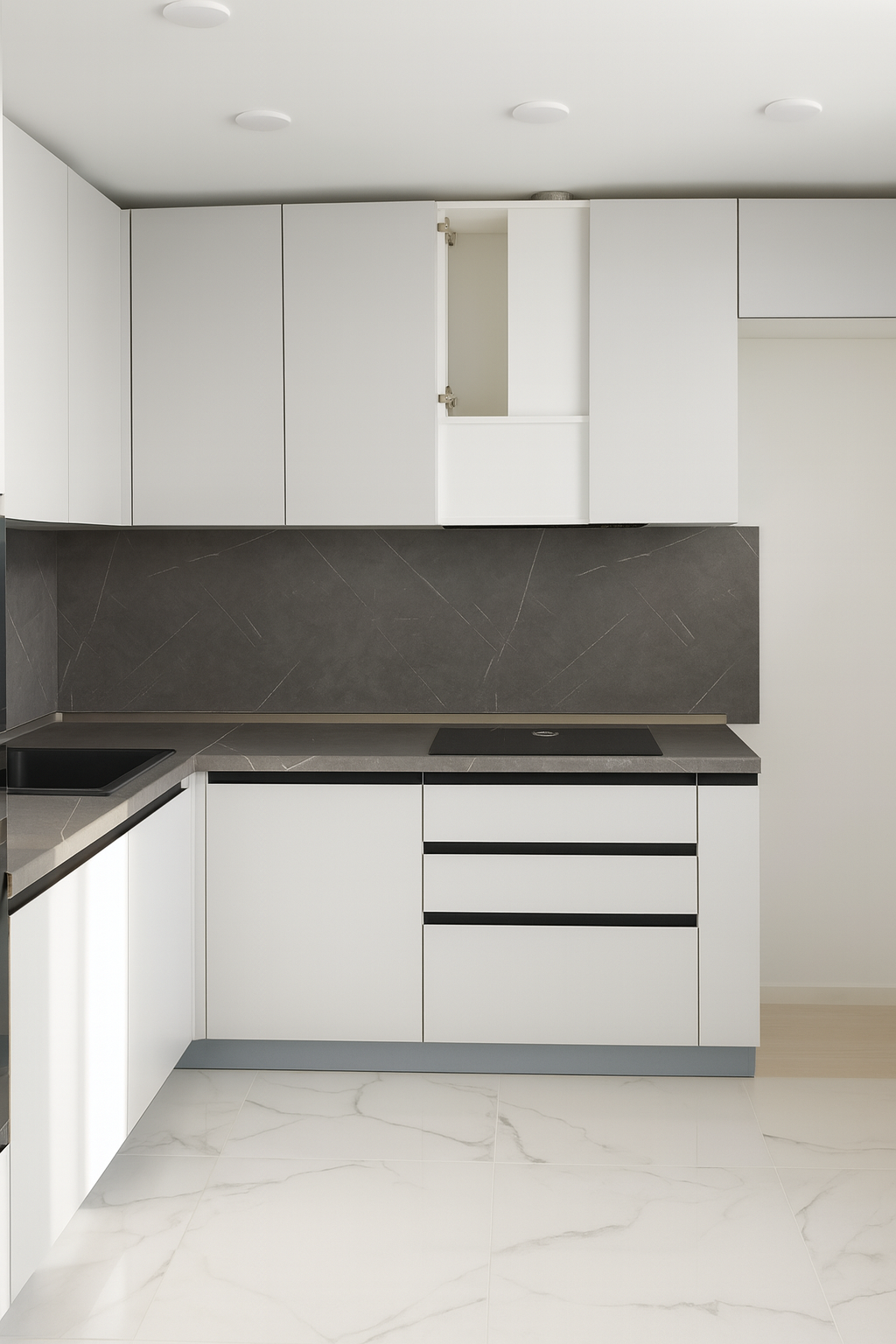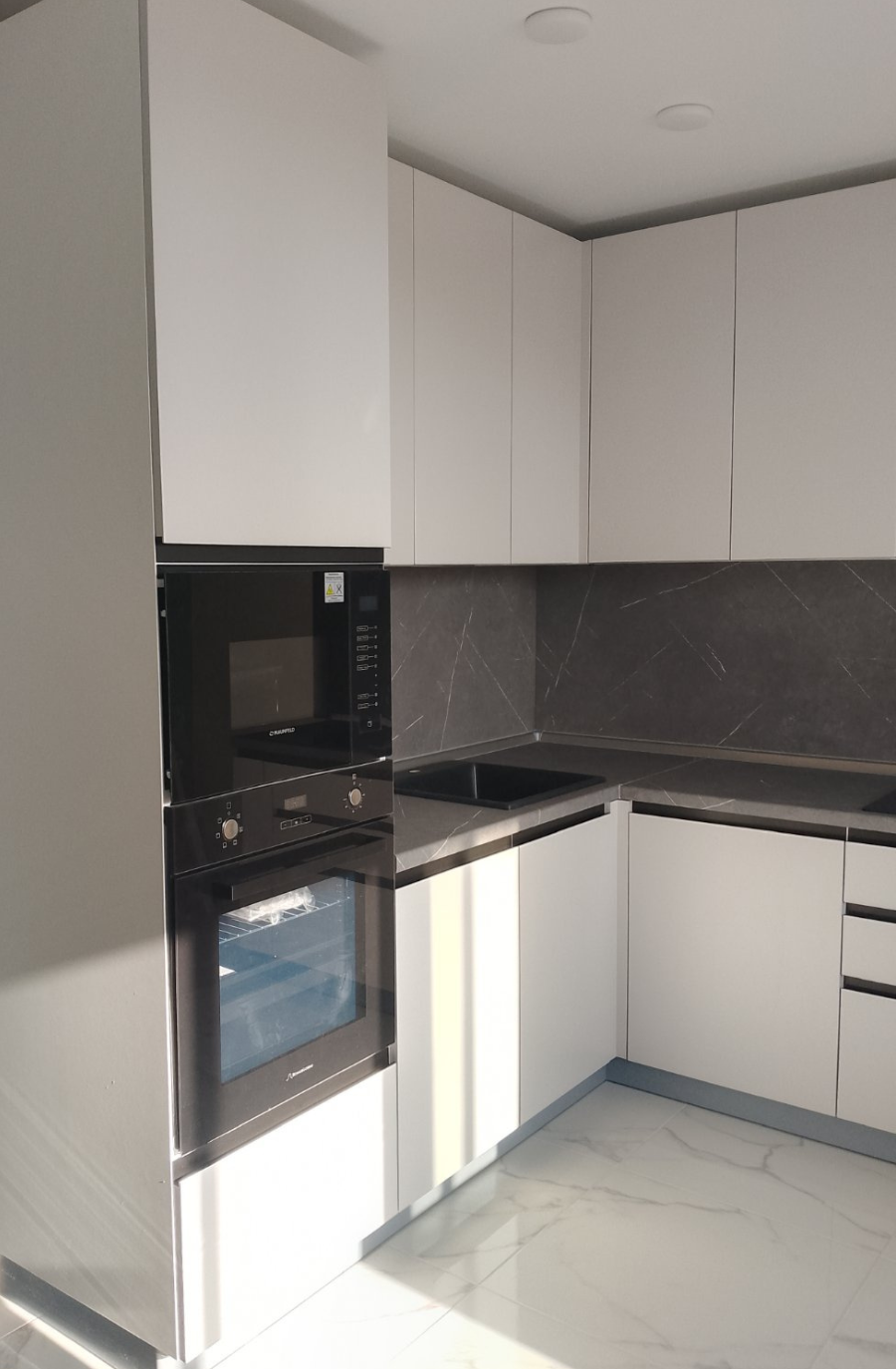 Угловая кухня в современном стиле с фасадами без ручек